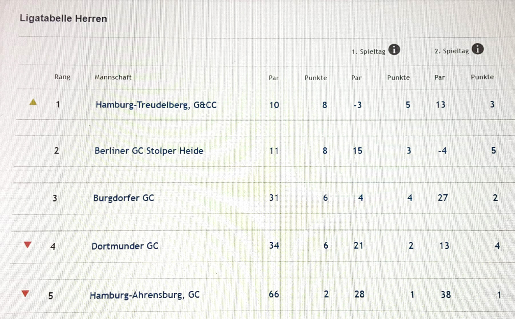 Klarer Tagessieger wurde Gastgeber Stolper Heide (vier Schläge unter Par), 17 Schläge vor Dortmund und den Blue Boys (+13). Damit schlossen die Berliner in der Tabelle zu den Blue Boys, die den ersten Spieltag in Hannover-Burgdorf klar gewonnen hatten, auf. Beide Teams führen nun mit je acht Punkten die Tabelle an, sie trennt nach zwei Spieltagen ein einziger Schlag (siehe oben). Auf den Rängen drei und vier folgen mit jeweils sechs Punkten Hannover-Burgdorf und Dortmund, der Gastgeber am nächsten Spieltag (12. Juni).