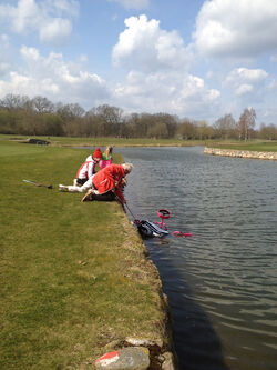 Der Wind, der Wind… Plötzlich und unerwartet setzte sich der Trolley in Bewegung und plumpste in den See. Dank des beherzten Eingreifens von Gerd Gottschalk und Regine Ulber und einer Ballangel konnte der Trolley der jungen Spielerin aus dem See gezogen werden. Mit nassem Bag ging es dann weiter auf die C.