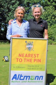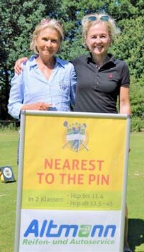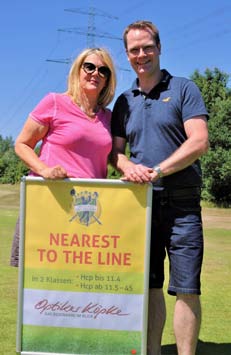 Selbst auf dem Platz war um diese Zeit schon Betrieb: Am Tee zur A4 warteten Iris Gödecke und Gordon Koch darauf, die Spieler von den Angeboten und Leistungen des Optikers Köpcke zu überzeugen. Bruni Altmann und ihre Tochter Alexandra Ludwig hatten sich wieder die Bahn B4 ausgesucht, um beim Wettbewerb »Nearest to the pin« für ihr sehr erfolgreiches Unternehmen Reifen-Altmann zu werben. Und den Kampf um den längsten Schlag des Tages, der in der Klasse bis Handicap 11,4 dem Treudelberger Peter Siercke und in der Klasse ab 11,5 seinem Klubkameraden Nils-Felix Neumann gelang, belohnten schließlich Belma Amcovic und Sebastian Bartels von der Firma Nord-Ostsee-Automobile mit einem kühlen Getränk.