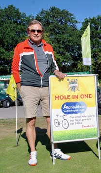 Das Ganze möglich machten nicht zuletzt aber auch in 2018 vor allem die Sponsoren. Viele von ihnen gehörten deshalb ebenfalls zu den Frühaufstehern. So wie Franz Zehrer, der Unternehmensberater, der als freiberuflicher Golfballexperte über die Vorzüge der von ihm auf der Driving-Range präsentierten Titleist-Produkte referierte. Wenige Meter entfernt bot der Küchenprofi Olaf Reinecke seinen Weckdienst in Form frisch gebrühter Kaffeespezialitäten an. Vor der Golfrezeption präsentierten schließlich Jens-Uwe Marquard und Peter Siercke besondere Elektromobile. Ersterer Golftrolleys von JuCad, letzterer exklusive Fahrräder von der Alpha-Mobil Vertriebs GmbH. Eines davon hätte es sogar als Preis für ein Hole-in-One gegeben. Doch das wollte keinem gelingen.