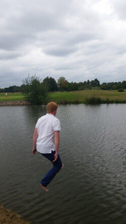 Justus Wähling, gestartet mit einer Stammvorgabe von 10,0 kam von der Runde zurück mit einer sauberen 68. Die Unterspielung um 4 Schläge „bescherte“ ihm eine neue Stammvorgabe von 9,2. Unter großem Beifall verfolgten alle Mitspieler den traditionellen Sprung ins Wasser.