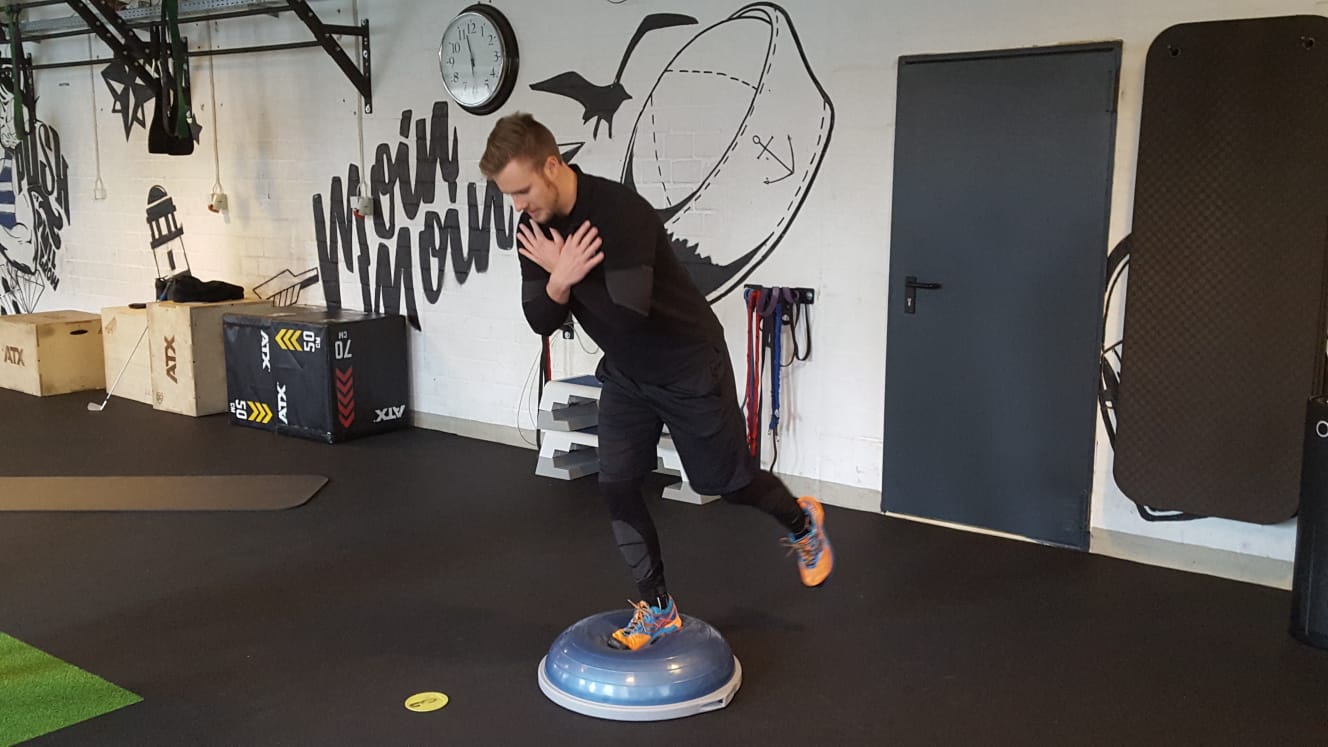 Dennis Meyerrose wirft einen Medizinball an die Wand und fängt ihn wieder auf. Zusätzliche Schwierigkeit: Er steht auf dem umgedrehten Bosu-Ball – eine wackelige Angelegenheit. So wird der Golfschwung dynamischer und explosiver