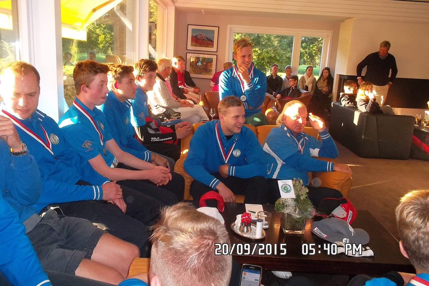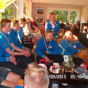 Am Nachmittag ging es dann gegen den Aufsteiger in die 2. Bundesliga, den GC Wendlohe, mit der gleichen Mannschaft um den Einzug ins Finale. Dieses Spiel wurde zu einem echten Krimi, leider mit dem schlechteren Ende für uns Treudelberger. Dass wir aber erst überraschend am allerletzten Loch im allerletzten Spiel gegen den Favoriten die Segel streichen mussten, war zumindest ein Teilerfolg, wenn auch mit einem kleinen bitteren Beigeschmack! Letztendlich war es dann auch noch der allerletzte Put, der unseren Einzug ins Finale verhinderte. Kopf hängen lassen war aber nicht angesagt. Wir hatten ein Ziel vor Augen. Wenn auch ein fast unerreichbares Ziel. Am Sonntagmorgen sollte es um die Bronzemedaille gehen. Der Gegner schien im ersten Moment unschlagbar. Immerhin ging es gegen den GC Hittfeld - vor nicht allzu langer Zeit noch in der 1. Bundesliga und in diesem Jahr immerhin auf Platz zwei der 2. Bundesliga. Klarer Favorit also. Aber unsere Treudelberger Jungs sind wieder ein echtes Team geworden. Und wer meint, dass Golf kein Mannschaftssport ist, sollte zukünftig einmal mit uns reisen und sich vom Gegenteil überzeugen. Unter dem neuen Trainer Mel Johnson haben sich alle Spieler nach dem grauenvollen Jahr 2014 unglaublich weiterentwickelt. Und genau das zeigten die Jungs am Sonntagmorgen in den nun 8 zu spielenden Einzeln und den späteren 4 Vierern. Mit dem sensationellen Zwischenergebnis von 5,5 zu 2,5 nach den Einzeln ging es in die nachmittäglichen Vierer. Ein Punkt fehlte uns nur noch zur ersten Medaille. Nur noch? Es wurde ein Krimi, der an Dramatik kaum zu überbieten war. Die Hittfelder zeigten, warum sie nur knapp am Wiederaufstieg in die 1. Bundesliga gescheitert waren. Schnell gewannen sie die Vierer gegen Bethje/Ellis bzw. Schultz/Naundorf, so dass es plötzlich nur noch 5,5 zu 4,5 stand. Zu diesem Zeitpunkt sah es bei den anderen beiden Vieren auch nicht rosig aus. Meyerrose/Kruse gingen 1 down auf die 17. Spielbahn und unsere beiden Youngsters lagen nach 16 Löchern 2 down. Das gesamte Match schien noch zu Gunsten der Hittfelder zu kippen. Mit einem überraschenden Chip in und dem damit verbundenen Lochgewinn gelang es Dennis und Michael all square auf die 18. Spielbahn zu gehen. Diese wurde dann in dramatischer Weise auch noch geteilt, so dass es jetzt 6,0 zu 5,0 für uns stand und alles nach einem Stechen aussah (3 Spieler jeder Mannschaft spielen maximal 3 Löcher Mann gegen Mann). Die Youngsters (wir nennen sie immer liebevoll „unsere Zwerge“) hatten zwischenzeitlich aber noch die 17.Spielbahn gewonnen. Es ging also nur noch 1 down auf die 18. Um es kurz zu machen: “unsere Zwerge“ gewannen tatsächlich auch noch diese Spielbahn und statt des Stechens hatten wir plötzlich die Bronzemedaille gewonnen!