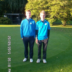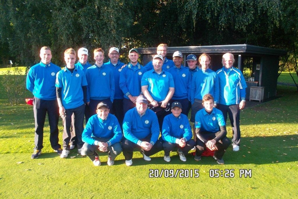 Gespielt wird diese Meisterschaft seit 2013 in einem neuen Format. Geblieben ist das Lochspiel Mann gegen Mann. So werden am Samstag die Viertelfinals und die Halbfinals jeweils mit 6 Einzeln und einem Vierer gespielt. Für uns traten im Viertelfinale gegen den GC Holm folgende Spieler im Einzel an: Tobias Naundorf, Dennis Meyerrose, Michael Kruse, Philipp Bethje, Marc Ellis, Leif Radszat und im Vierer unsere beiden 14jährigen Debütanten James Kershaw und Tom Schmanns. Ersatzspieler waren Torben Schultz und der ebenfalls erst 14jährige Maximilian Breuell. Nachdem Dennis Meyerrose und Michael Kruse ihre beiden Spiele sehr schnell und deutlich gewonnen hatten, verlor Tobias Naundorf sein Match. Alle anderen Matches waren dann sehr eng. Während unsere beiden Youngsters am 17.Loch ihr Spiel 2 und 1 gewinnen konnten, gingen die anderen drei Partien alle auf das letzte Loch.Philipp Bethje gewann dann sein letztes Loch und die anderen beiden teilten auch ihre Spiele, so dass wir am Ende deutlich mit 5,0 zu 2,0 gewinnen konnten. Der erste Schritt zur Medaille war also gemacht.