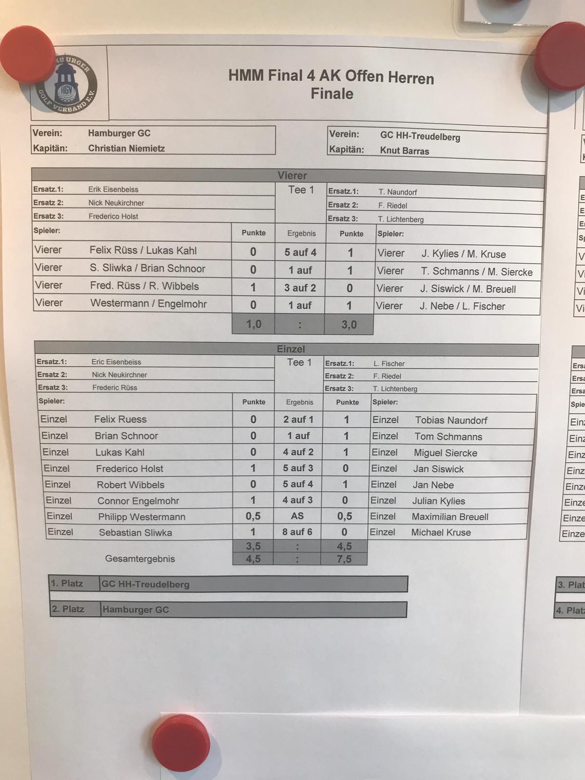„Nicht untergehen“ war unsere Devise! Aber dann kam alles ganz anders. Nachdem der erste Vierer klar gewonnen wurde und der 2 Vierer verloren ging, behielten unsere Jungs im 3. und 4. Vierer die Nerven und gewannen jeweils am 18. Loch ihr Match. So stand es nach den Vierern 3:1 für Treudelberg. Das Tagesziel war damit eigentlich erreicht. 2,5 Punkte aus den 12 Matches wollten wir mindestens holen. Aber dann kam alles anders. Hochkonzentriert gingen alle 8 Spielerunterstützt von ihren Caddys, in ihre Einzel am Nachmittag. Die Jungs ließen vom ersten Loch anerkennen, dass sie mehr wollten. Am Ende dann hatten wir tatsächlich nur 3 Matches verloren, eins geteilt und 4 Einzel wurden gewonnen. Somit wurden 7,5 von 12 möglichen Punkten geholt und jetzt dürfen wir uns erstmals Hamburger Meister nennen!