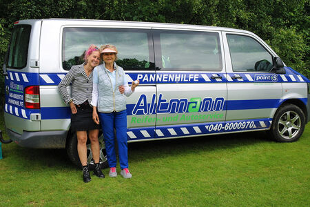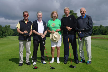 und das Präsidiums-Team Michael Schmanns und Jörg Fenner (v. l.) auf den Kurs. Mitte: Bei Anke Neyer stand der Prominenteste am Start: Willi Schulz mit Jörg Schubert, Peter Caro und Klaus-Werner Altmann (v. r.). Rechts: Statt Pannenhilfe spendierten die Altmann-Damen diesmal Prickelwasser und neue Golfbälle