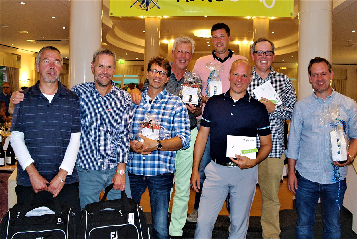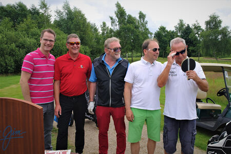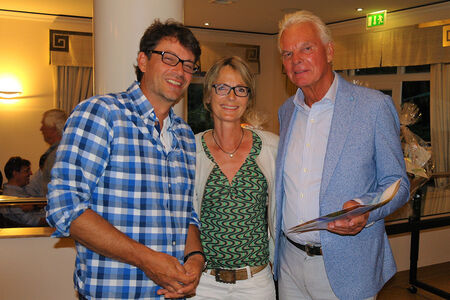 Wo bitte also war alles eine Nummer kleiner? Nun ja, am 19. Loch gab es zunächst mal nur einen kostenlosen Drink und tatsächlich war 2017 nicht jede Spielbahn an einen Werbepartner verkauft. Aber diesen Unterschied zum Vorjahr hätte wohl kaum einer bemerkt, wenn der Macher des Ganzen, Treudelbergs Vizepräsident Jörg Fenner, dieses bei der Siegerehrung nicht extra erklärt hätte. An den Preisen, die er im Rahmen eines üppigen bayerischen Buffets nebst jeder Menge guter Tropfen und gemeinsam mit seinem Co-Organisator Hans-Werner Arleth verlieh, wurde jedenfalls nicht gespart. So freuten sich die Gewinner der verschiedenen Nettoklassen erneut über wunderschöne Armbanduhren von „Juwelier Willer“ und die Bruttosieger trugen wieder reichlich gefüllte Präsentkörbe aus dem Hause „Feinkost Bannat“ nach Hause. Außerdem wechselten jede Menge Champagner, gespendet von Dieter Götz, Essenseinladungen, zum Beispiel vom „Restaurant Lenz“, Reisegutscheine, etwa vom „Sporthotel Reisch“, und viele weitere attraktive Sachpreise die Besitzer. Für einen ganz besonderen Moment sorgte schließlich noch die Ziehung der Tombola-Preise. Weil sie gerade zufällig in der Nähe war, fiel das Los der Glücksfee auf Kerstin Bieringer vom Golfclub Gut Apeldör. Und wen zog sie aus dem Hut, als es um den Hauptpreis ging, eine von „Jürgen Weiss Immobilien“ gestiftete zweiwöchige Reise nach Teneriffa? Ihren Mann – von wegen Glück im Spiel, Pech in der Liebe.