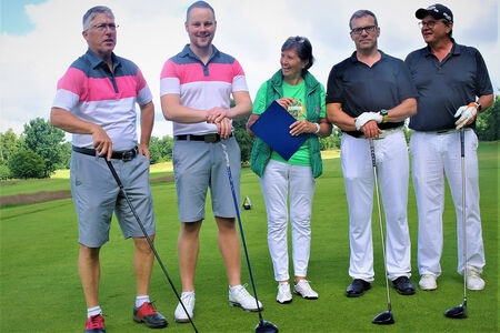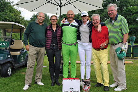 Links: Strahlende Gesichter auch bei den Damen von „Engel & Völkers“ – hier mit Manfred Hessler, Günter Heydecker, Rainer Ploog und Bernd Augustin (v.l.). Mitte: Brachten alle erfolgreich an den Start: Die doppelten Julias, Smailes (li.) und Stegmann. Rechts: Durstige Golfer mit den Engeln der Fairways Adriane Beck (li.) und Ingeborg Roggensack