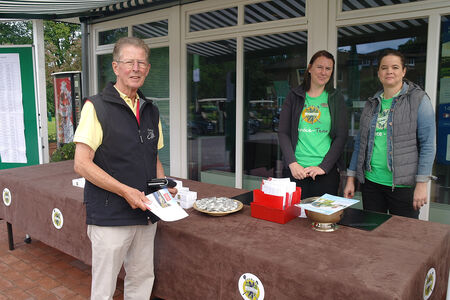 Links: Eigentlich macht er ja in Küchen. Für Treudelbergs Golfer spielt Olaf Reinecke (ganz links) aber immer wieder gerne den Kaffeeonkel. Mitte: Zur Stärkung nach dem 9. Loch gab es nicht nur leckere Hot Dogs. Rechts: Was für ein Zufall: Kerstin Bieringer zog ihren Mann als Gewinner der von Jürgen Weiss (r.) spendierten Teneriffa-Reise