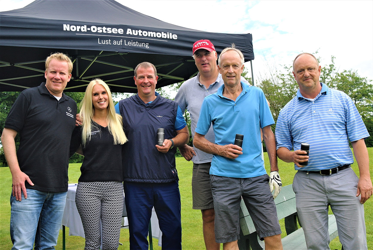 Oder die diversen Überraschungen, die auch diesmal wieder an vielen Spielbahnen auf die Teilnehmer warteten. Auf der A4 ging es etwa darum, möglichst „Nearest to the line“ zu liegen, um die vom „Optiker Köpke“ zur Belohnung ausgesetzten modischen Sonnenbrillen zu gewinnen. An der A8 ließ „Nord-Ostsee-Automobile“ die Männerherzen nicht nur durch die Anwesenheit einer hübschen jungen Blondine höher schlagen. Hier hieß es am Ende vor allem, seinen Ball „Nearest to the pin“ zu platzieren. Genauso wie an der B7, wo gleich zwei Damen von „Engel & Völkers“ den Spielern den Tag nicht nur mit Schokoriegeln versüßten, sondern mit der Zugabe von Pitchgabeln auch noch zur Platzpflege beitrugen.