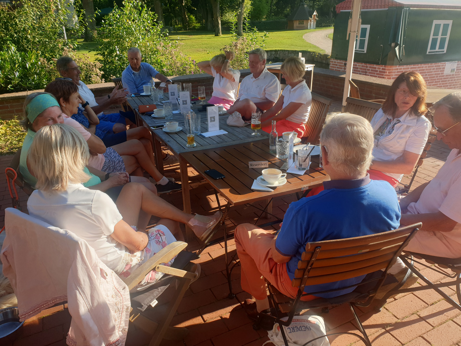 Nach dem letzten Putt war die Hauptterrasse des Hotels durch andere Spieler besetzt, sodass uns nur die Seitenterrasse blieb, wir aber auch dort vom Service gefunden wurden. Der vom Hotel auf Kosten der Herrenkasse bestellte Kuchen war sehr übersichtlich, allerdings genießbar, die kleinen Stücke sorgten bei einer großen Anzahl von Mitspielern aber für viele Fragen.