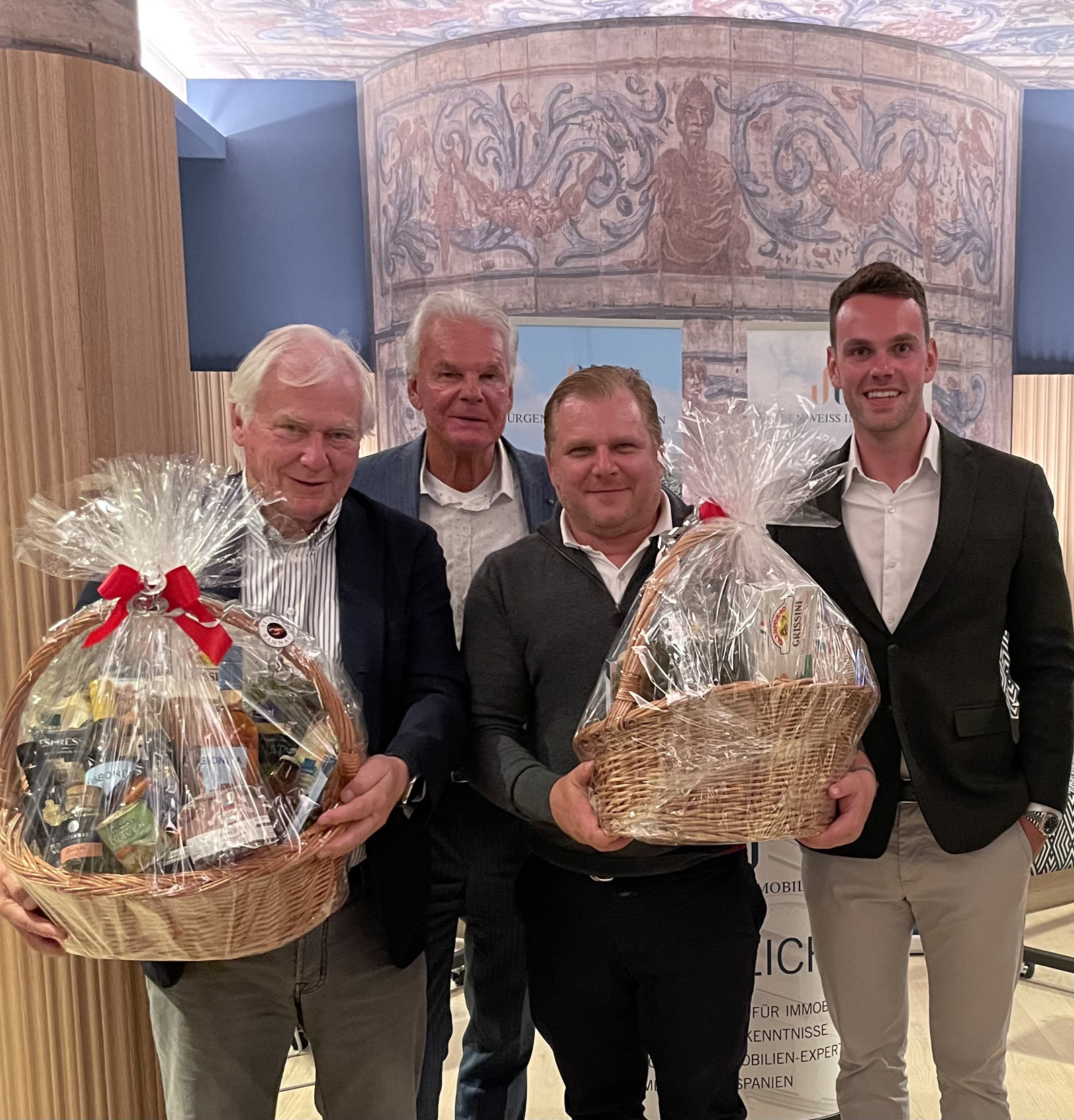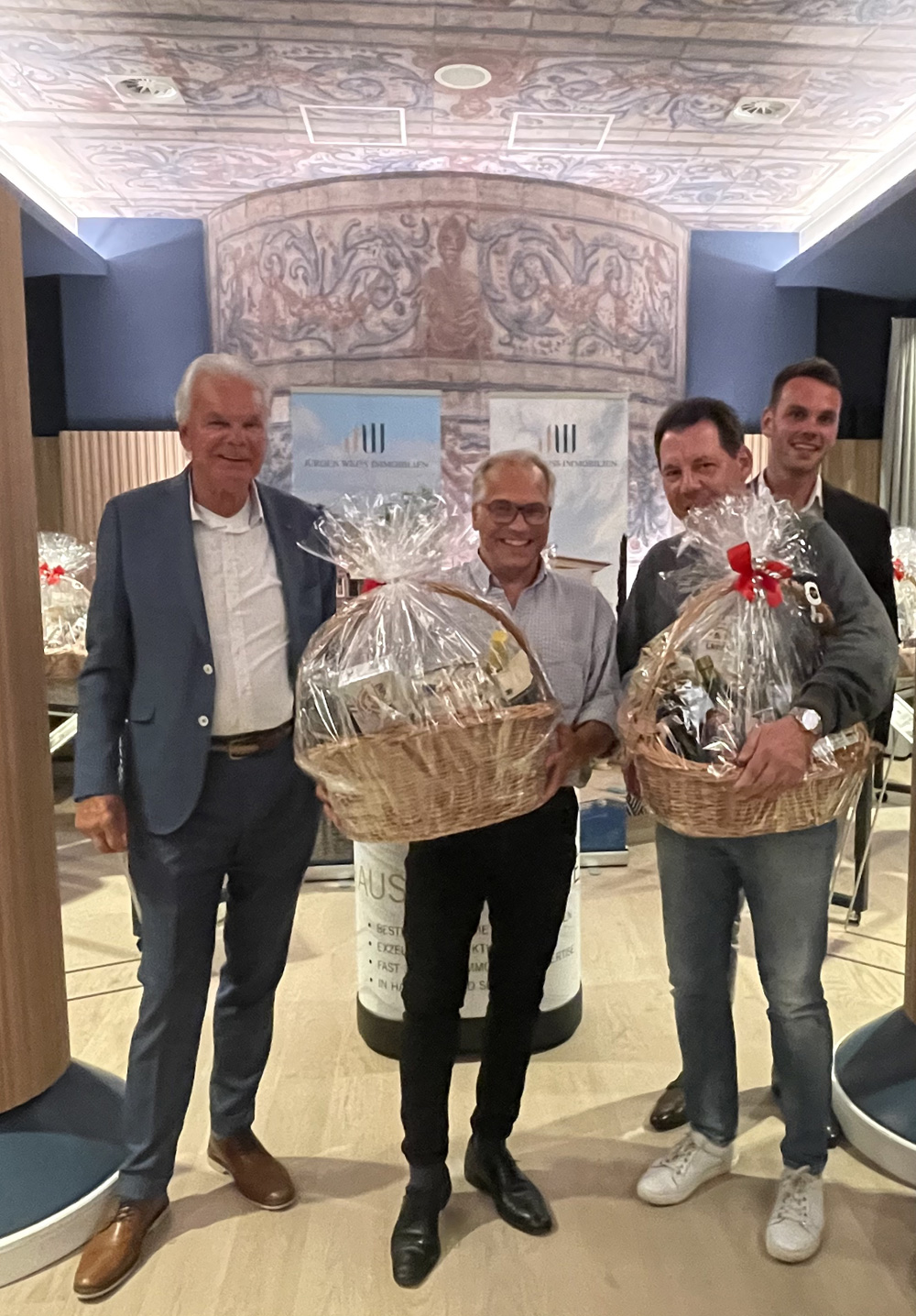 Dritter in der Netto-B-Wertung: Niels Jacobsen (2. v. l.) und Thomas Langhein, flankiert von Jürgen (l.) und Felix Weiss. Die Präsentkörbe kommen von Feinkost Bannat -