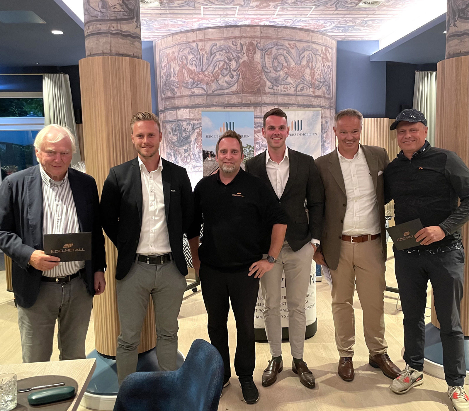 Sieger im Wettbewerb „Nearest to the Pin“: Georg Müller (l.) und Peer Dietrich (r.). Zwischen ihnen stehen (v. l.): Dennis Meyerrose, Tim Tippelt (Edelmetall-Golf), Felix Weiss und Uwe von Böhl -