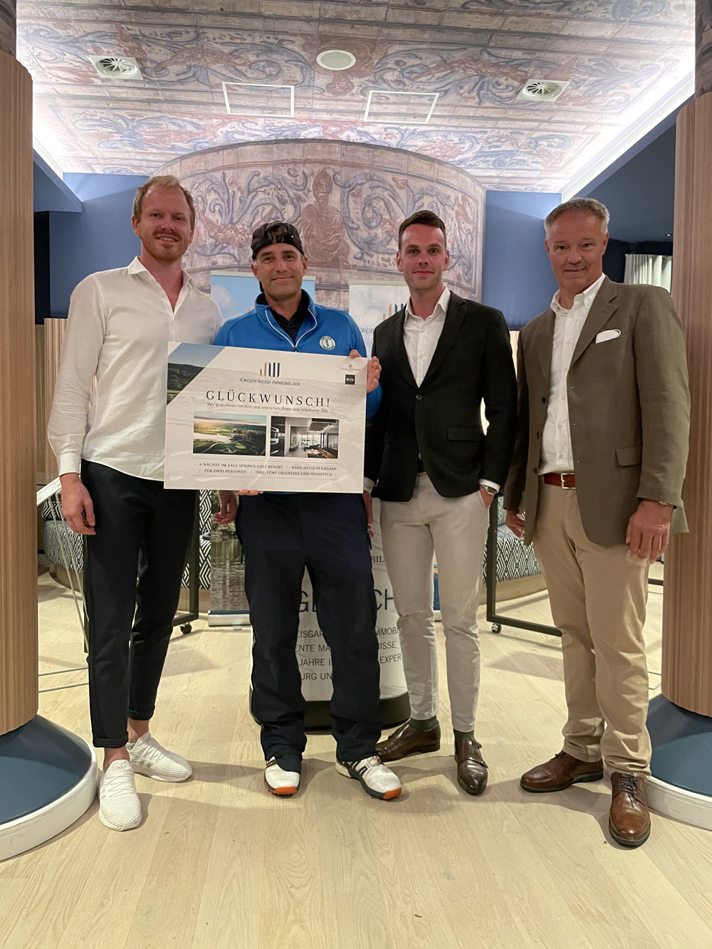Gewann den Traumurlaub: Holger Valentin (2. v. l.). Den Sonderpreis übergab Robin Heim (l., für Zala Springs Golf Resort), erste Gratulanten waren Felix Weiss und Uwe von Böhl (r.)