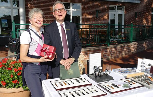 Die glückliche und strahlende Gewinnerin der Sonderverlosung am 2. Spieltag der PETER HAHN LADIES GOLF TOUR 2016 ist Frau Gabriele Gehrmann.  Herr Heinecke von JUWELIER HEINECKE  aus Hamburg- Eppendorf überreicht eine Uhr von MICHEL HERBELIN.